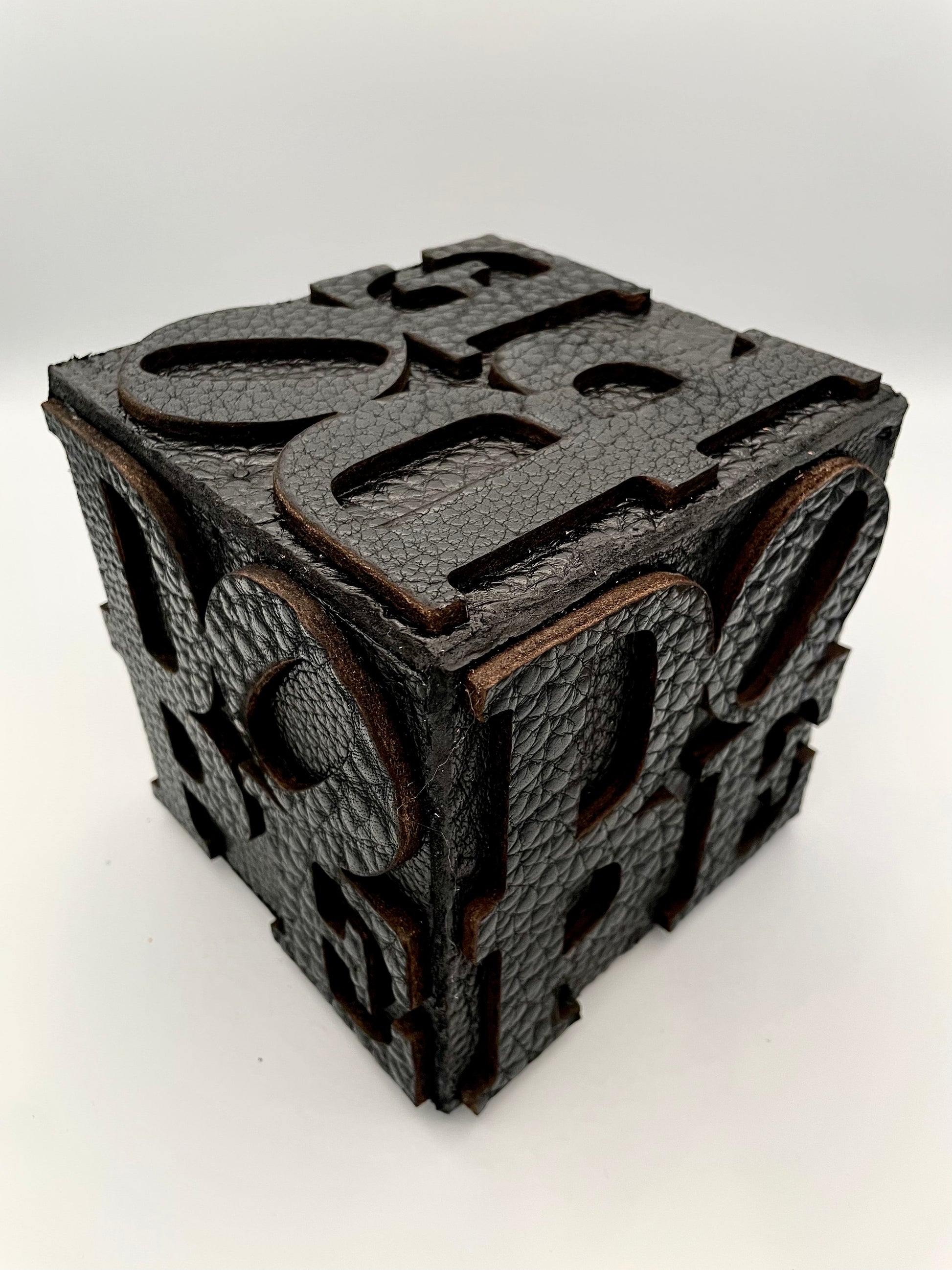 This DOPE box by artist DL Warfield is made of leather and wood. It’s 6.5” x 6.5”. Perfect for shelve artwork displays or desktops.